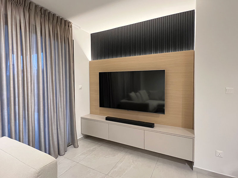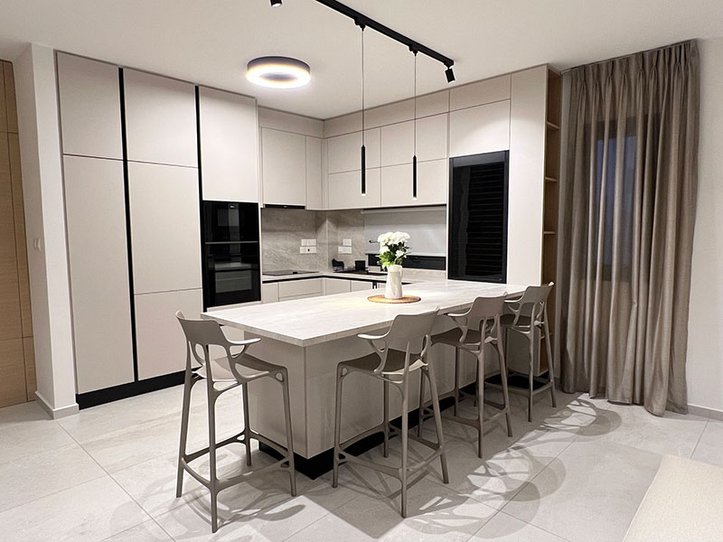 - Impressive wall claddings with melamine from Cyprus Forest Industries, decorated with aluminum strips that enhance the contemporary aesthetic of the space